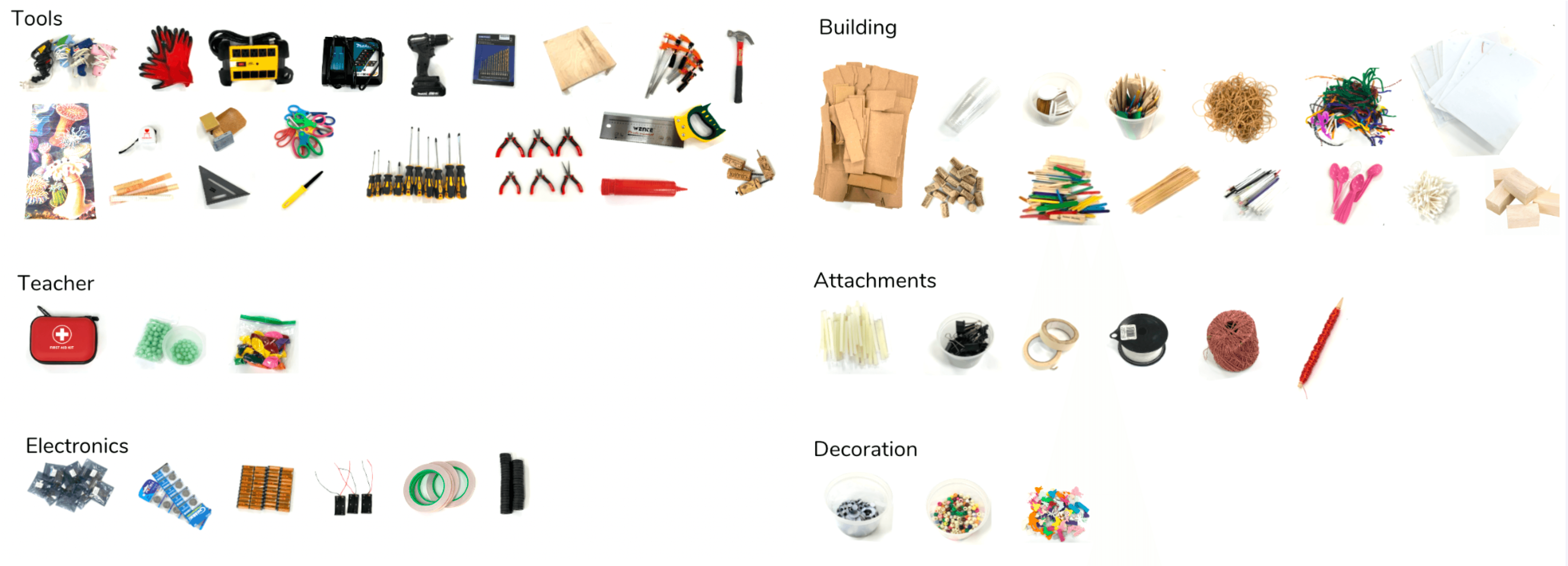 I experimented with running sessions using open materials instead of pre-made kits. By offering buckets filled with basic supplies like fabric, paper, popsicle sticks, and straws, I found the preparation process much easier. This approach also gave students greater creative freedom, as they weren't constrained by the limitations of pre-packaged kits.